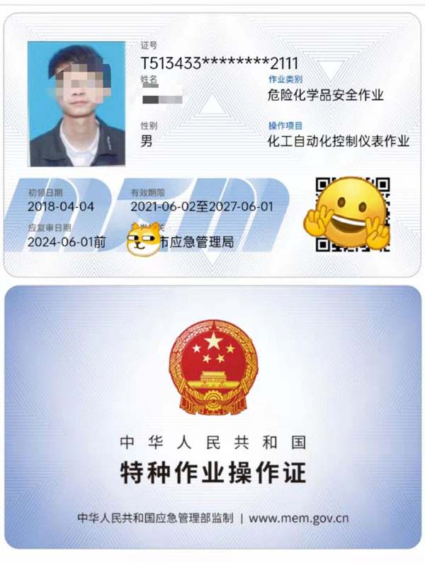 應急管理局?;纷鳂I證:過氧化工藝,烷基化工藝,氧化工藝,加氫工藝,化工自動化控制儀表作業;