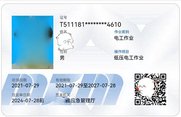 特種作業操作證: 作業種類:電工(俗稱 操作證 、 上崗證 ),分類:高壓運行維護作業、高壓安裝修造作業、低壓電工作業、安裝、維修、發電、配電。自2010年后,老版特種作業操作證( IC卡 )樣本改用二代身份證似的 IC卡 類新版中華人民共和國特種作業操作證樣本,復審為三年一審,可以用到60歲退休為止。